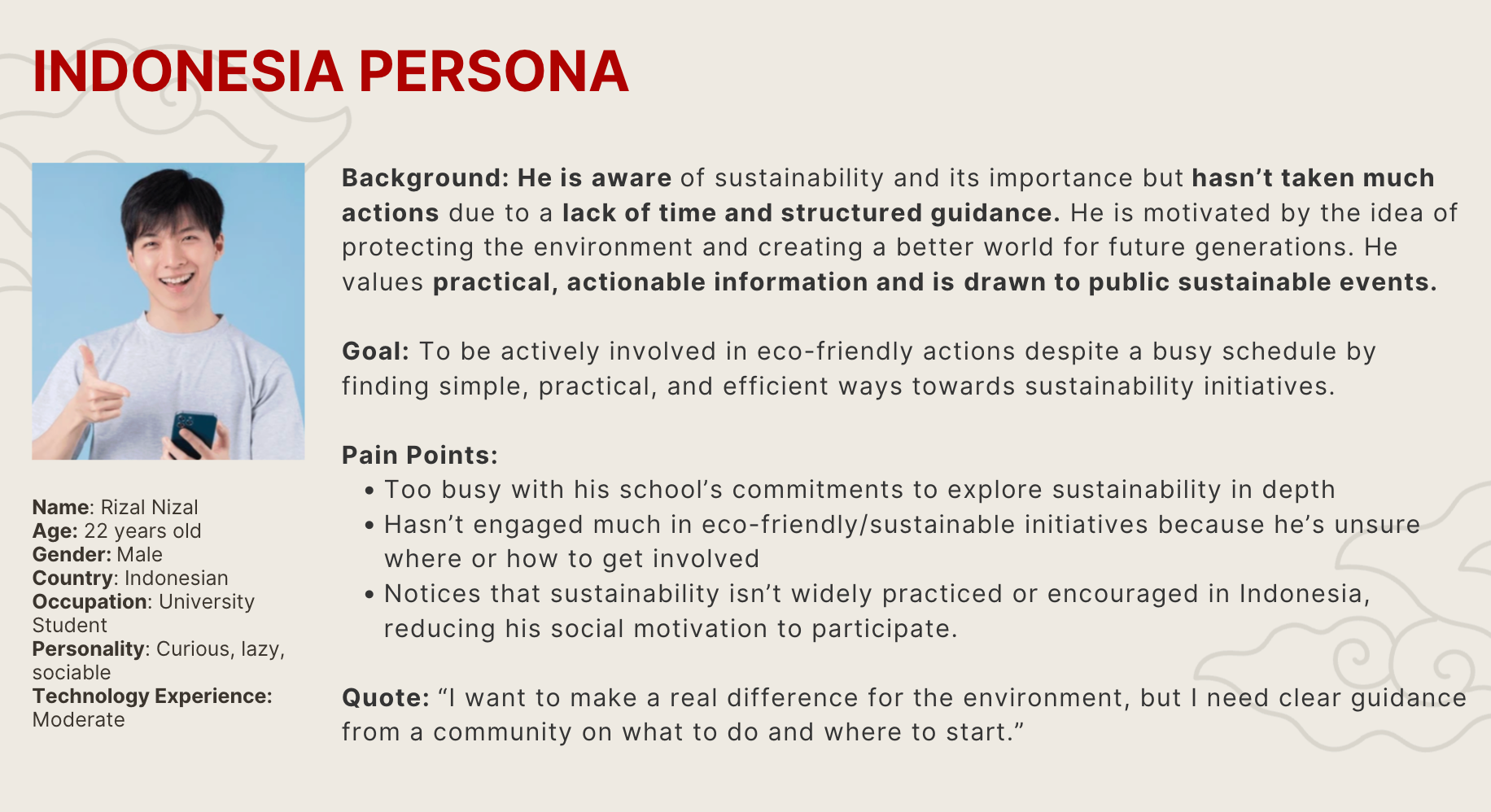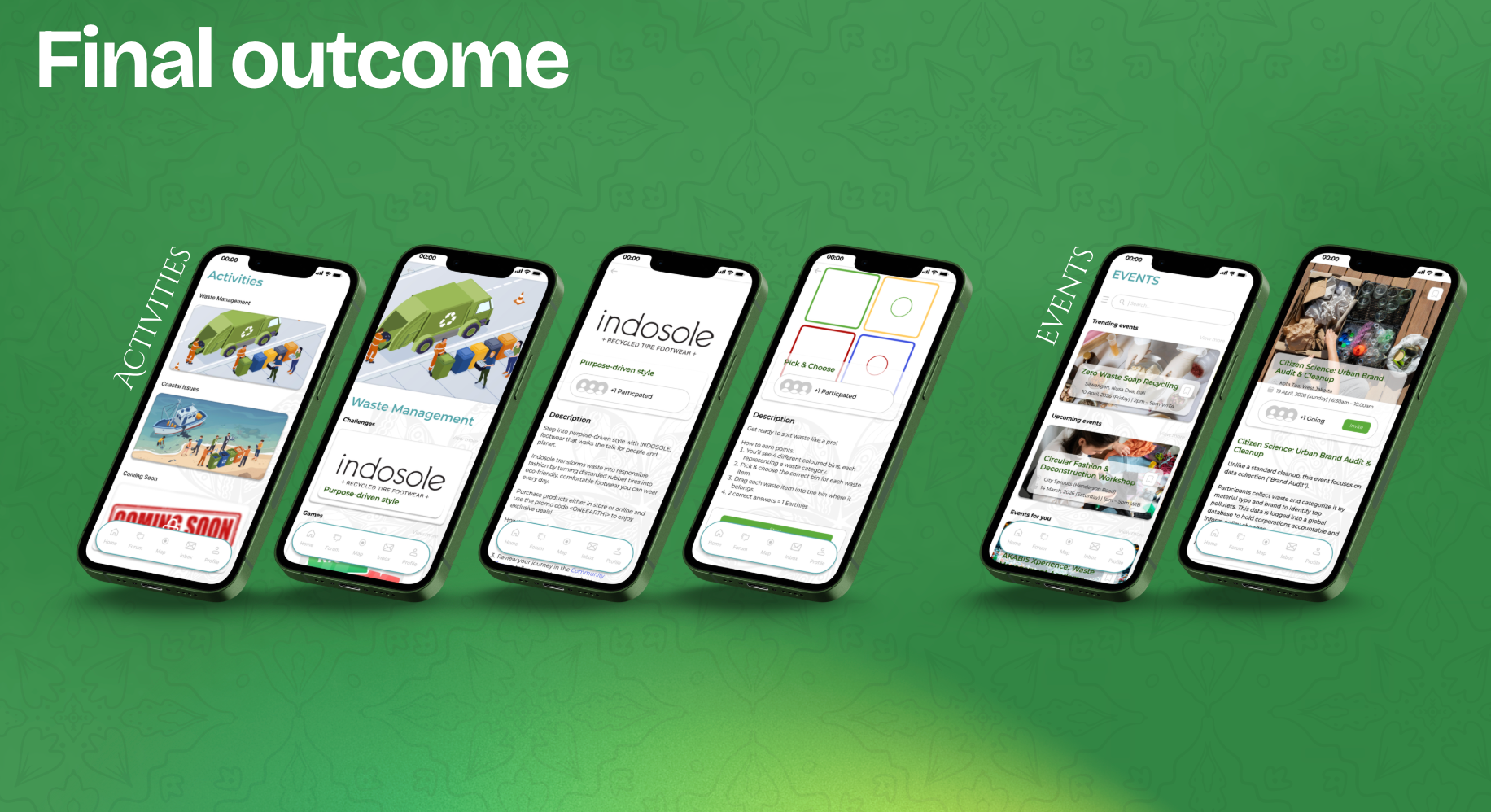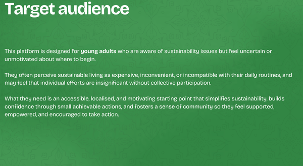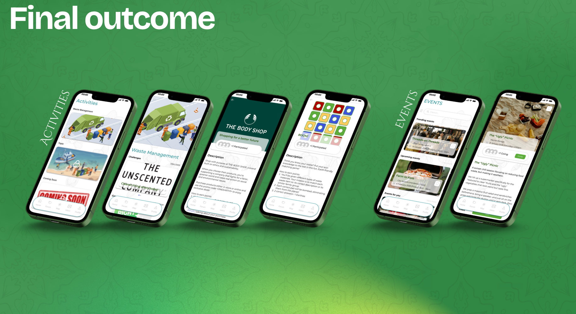 Our creative solution consists of a sustainability-focused mobile application that integrates localised real-life case studies, country-specific content, interactive activities, and community-driven engagement into one intuitive platform to educate, connect, and empower users to drive meaningful sustainability change.